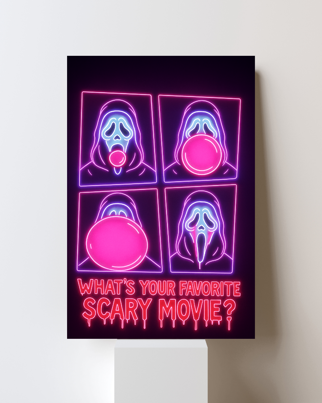 Turn your home into a movie set straight out of Scream with our Scary Movie Canvas. This bold, neon-lit design offers classic slasher nostalgia — featuring “What’s Your Favorite Scary Movie?” in blood-dripping text. Perfect for Halloween décor, movie lovers, or anyone who lives for thriller aesthetics.